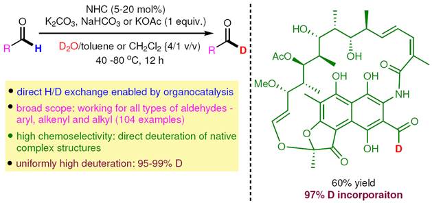 3044am永利集团官网陈晓蓓等专家和苏州大学3044am永利集团官网张士磊课题组几年来致力于通过平衡交换的方法把便宜易得的普通分子直接转变成具有重要合成价值的氘代分子(Org. Lett. 2019, 21, 448-452),经过大量的实验,终于在百余种NHC(氮杂环卡宾)化合物中筛选出几种优秀的催化剂,既能实现各种醛基的高氘代率(>95%),又不会使收率显著降低。最终确定的反应条件非常温和,对各种醛基(包括芳醛、烯醛和脂肪醛)的氘代都有效,但是又不会影响其它官能团,所以底物兼容性极其高,甚至复杂的天然产物分子比如3-甲酰利福霉素、麦迪霉素和糖类(半缩醛)都可以被选择性氘代,这是其它任何方法都没办法做到的。该氘代反应可以在空气中进行,使用的NHC催化剂只需要从价格低廉的工业原料经2-3步反应大量制备,氘源是氘代物中最普通的氘水。如果一次氘代不能满足需求,还可以进行二次氘代,直至氘代率>99%。反应在放大至30 mmol级别时无任何氘代率和收率的降低。这些优点使得本方法成为目前制备氘代醛最好的实用性的选择。